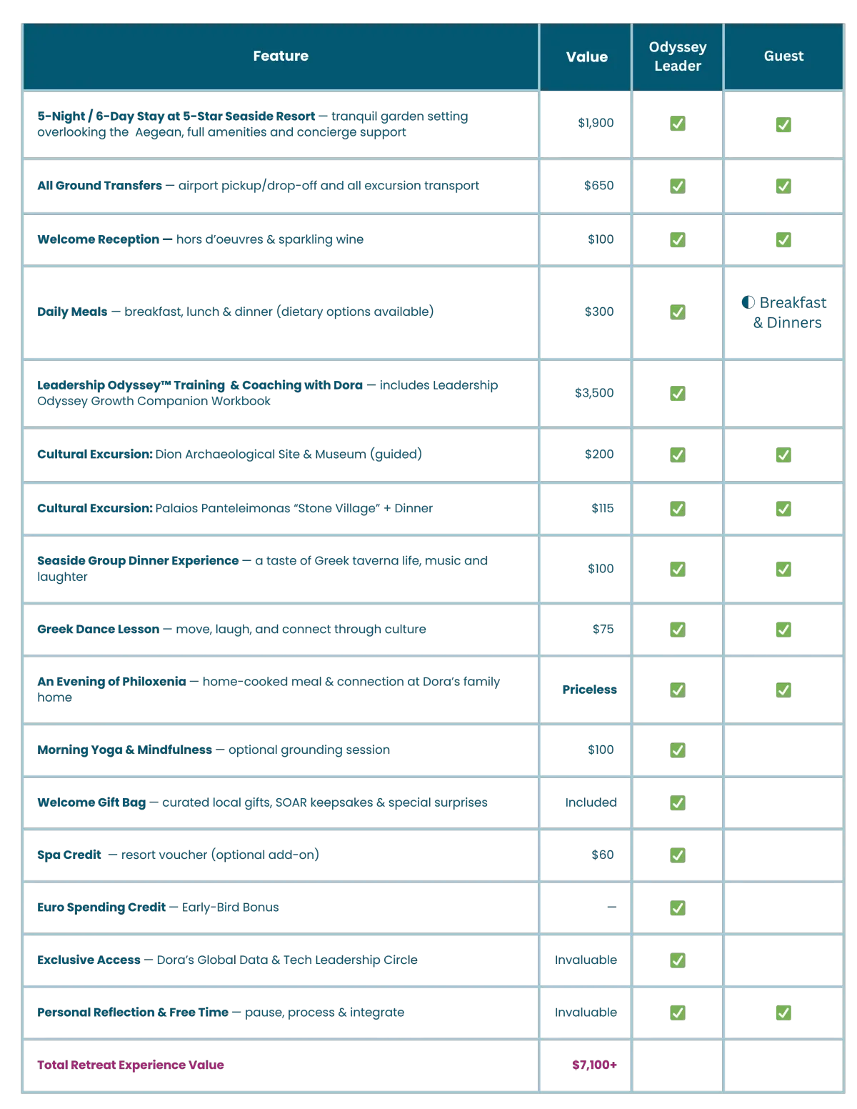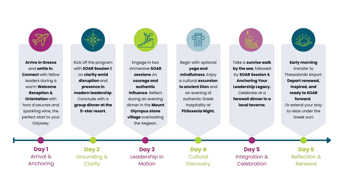 The Leadership Odyssey™ Retreat will take place from July 6–11, 2026. Participants will receive full itinerary details and travel guidance well in advance to support smooth planning and coordination.