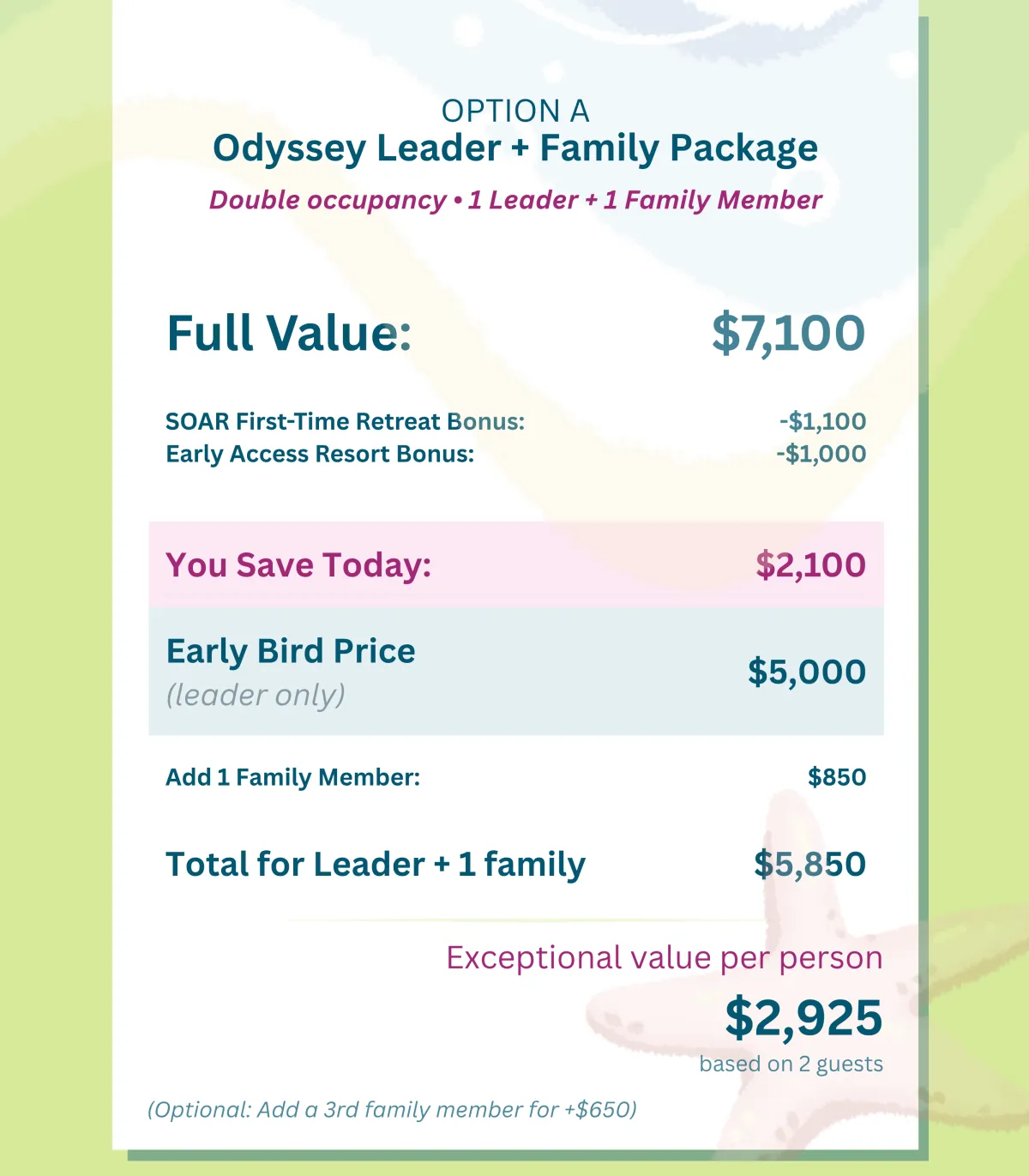 Option A: 1 leader + 1 family guest (spouse, partner, or immediate family). Optional add-ons: +$850 for first guest / +$650 for second (3-person max).