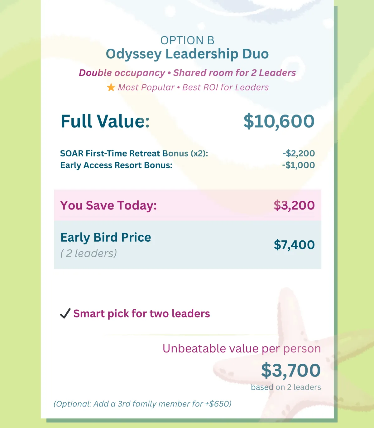 Your Early Bird Price Price (2 leaders): ................$7,400 USD