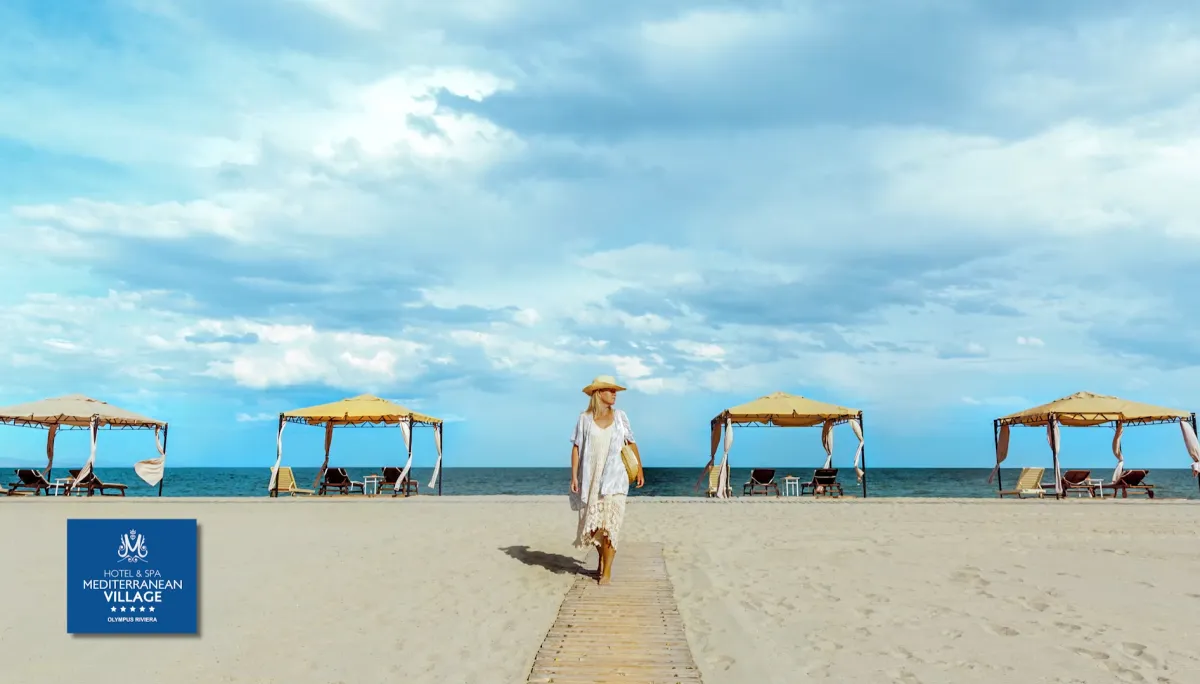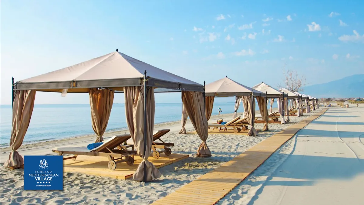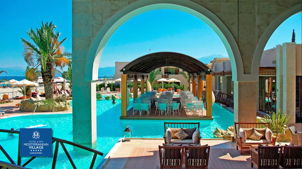 Enjoy seaside luxury at the Mediterranean Village Hotel & Spa, with private beach access, pools, spa, and world-class service surrounded by views of Mount Olympus and the Aegean Sea.